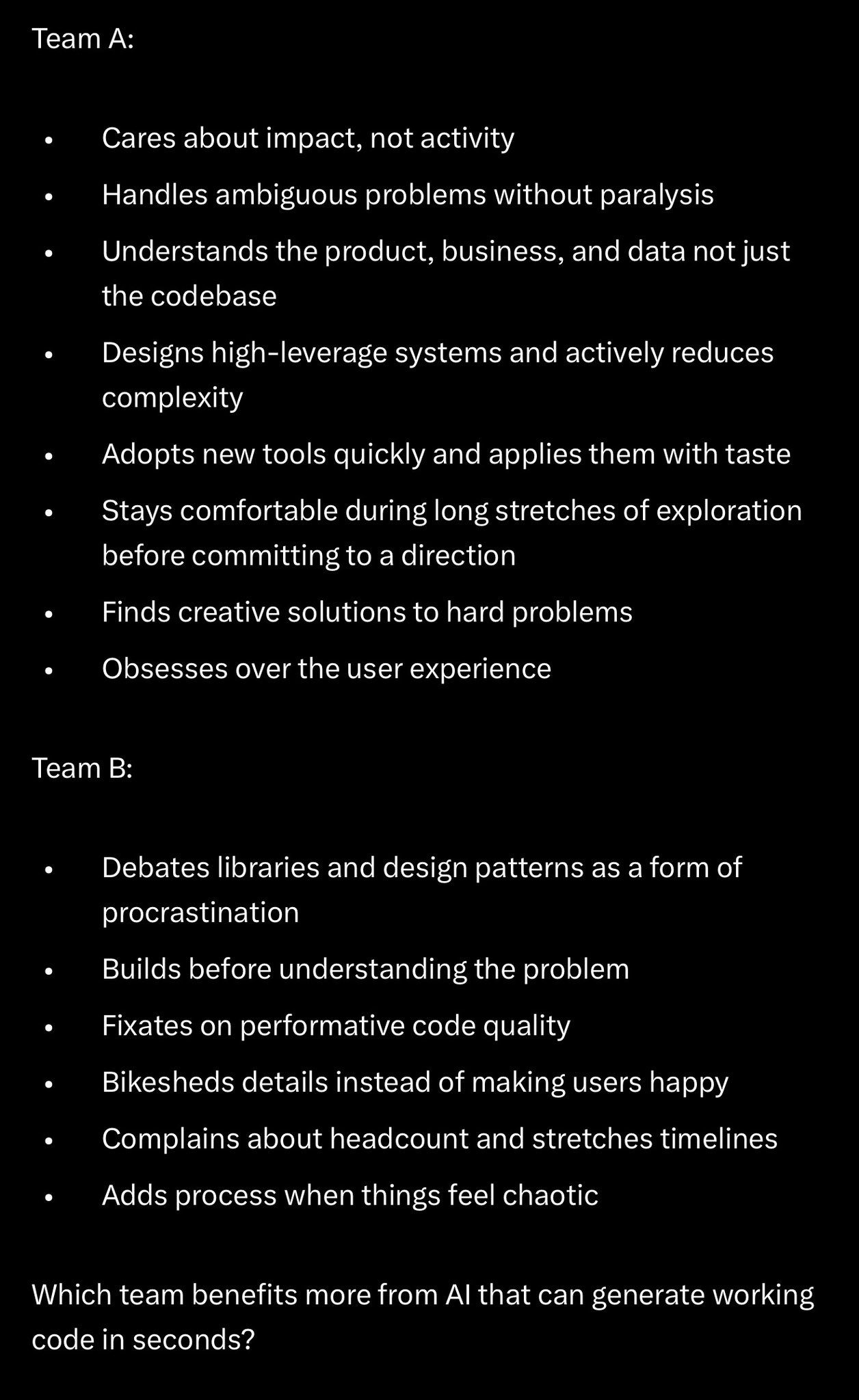 A list went viral on X explaining the difference between Team A and Team B players, detailing why Team A ultimately wins in the age of AI. While targetted at programmers, this framework has great principles for any craft:
